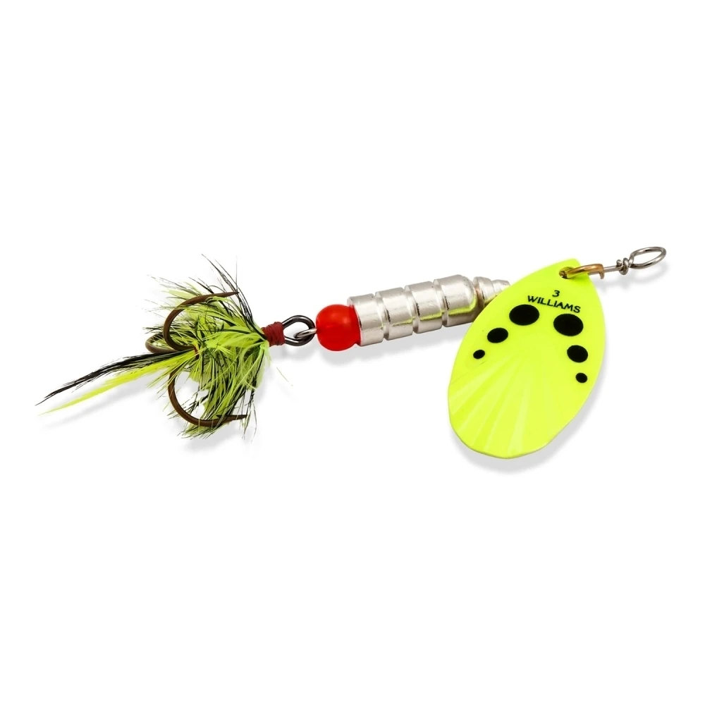 Блесна Williams VorteX V2DCHBD 5.7г — вращающаяся двухлепестковая модель 5.7 г длиной 30 мм в заметной желтой расцветке с черными точками. Стабильно работает по активному хищнику в разных условиях.