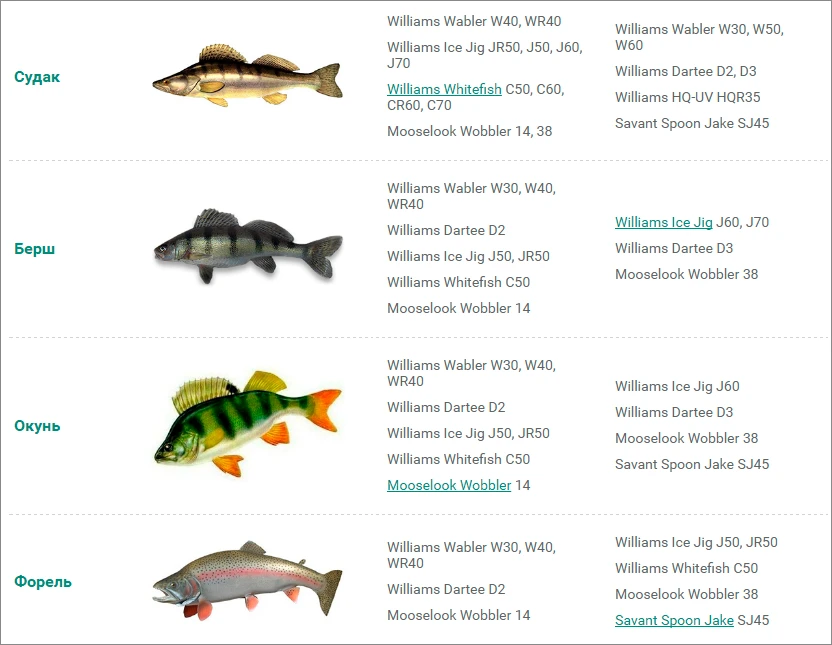 Теперь Вы можете воспользоваться таблицей, определяющей уловистость блесен Williams - Блесна Williams и Хищные рыбы. По ней Вы можете выбрать модель и размер блесны, ориентируясь на желаемый трофей. Расцветки блесен во многом зависят от предпочтений хищника в том, или ином водоеме.